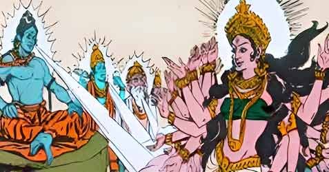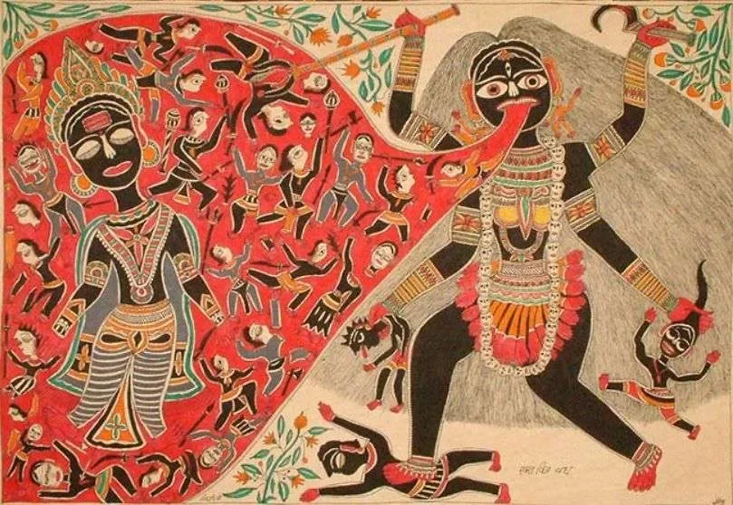 Kali, an aspect of Durga, was born from her third eye in a moment of intense rage and wrath during a battle with the demon Raktabija. As Durga fought the demon, his blood splattered, and each drop created new demons, making the battle nearly impossible to win. In response, Durga's furious energy manifested as Kali, a dark, powerful goddess who consumed the blood and eliminated the entire demon horde.