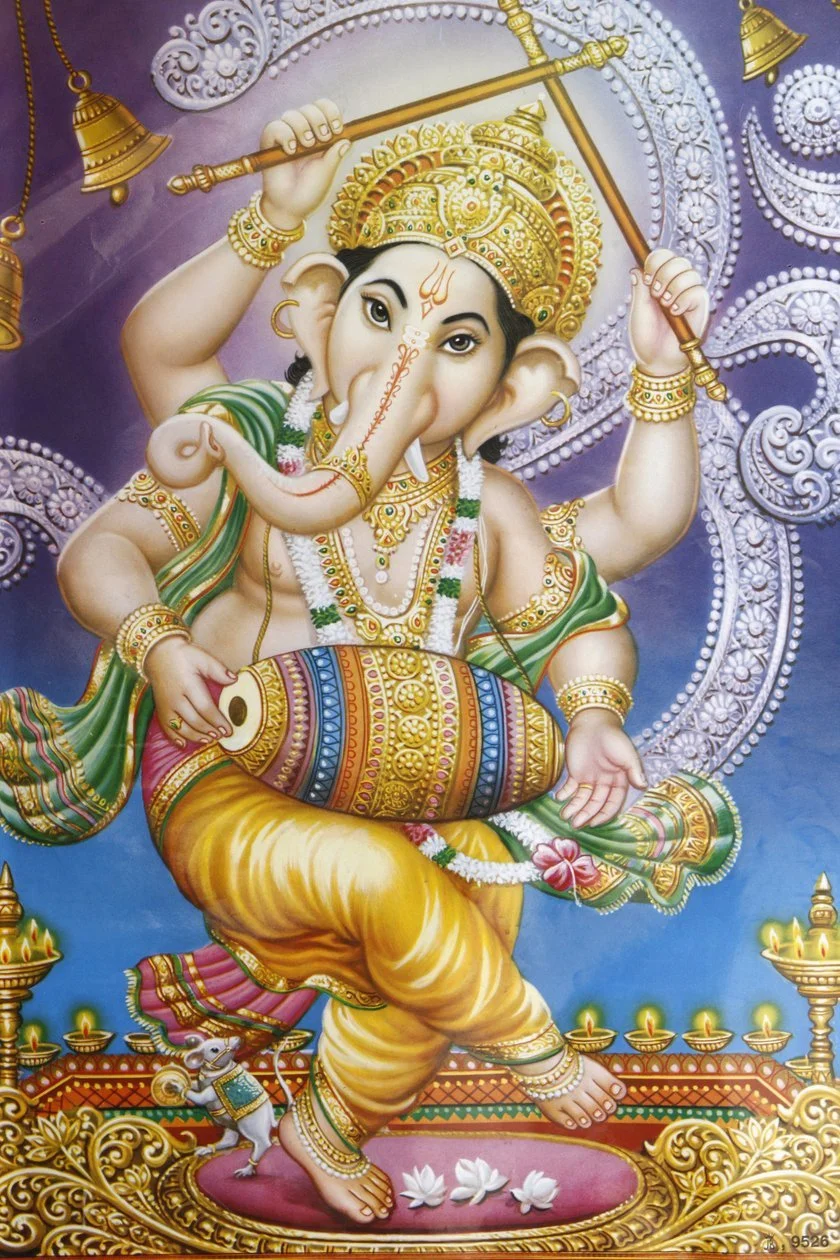 Ganesha is an elephant-headed Hindu god revered as the remover of obstacles, a symbol of wisdom, intellect, and new beginnings. He is widely known for bringing good fortune and prosperity to his devotees and is honored at the start of significant endeavors. Ganesha is often depicted with a large belly, multiple arms holding various items like an axe, a rope and his broken tusk. His vehicle is a mouse, which symbolizes his ability to overcome any fear.